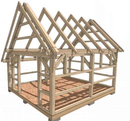 This 14' x 16' Shed would be great just about anywhere. This full plan includes everything to get you started building your dream Shed. We provide a sample foundation plan, sample first floor plan, sample architectural elevations with door and window schedules, a cross section detail, timber/fastener/connector list, all wall layouts, beam layouts, rafter layout, fastening details, and all single beam drawings. It uses 6x6 posts, 6x8 plate beams, 6x8 tie beams, 4x6 joists, 4x5 knee braces, 6x8 ridge plates and 4x6 and 6x6 rafters. Let us help you get started today with this set of plans!