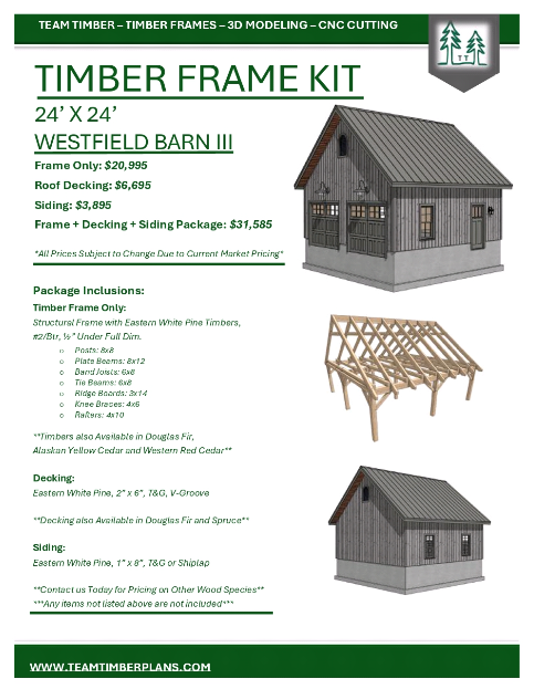 The frame design shown has not been engineered and is only intended as a general outline. It is the sole responsibility of the homeowner and/or contractor to determine if local or state code requires an engineer’s stamp on plans before erection. Team Timber, LLC does not design to a specific area and for that matter will not hold any reasonability or warranty plans if plans do not satisfy the requirements of local and/or state building codes.