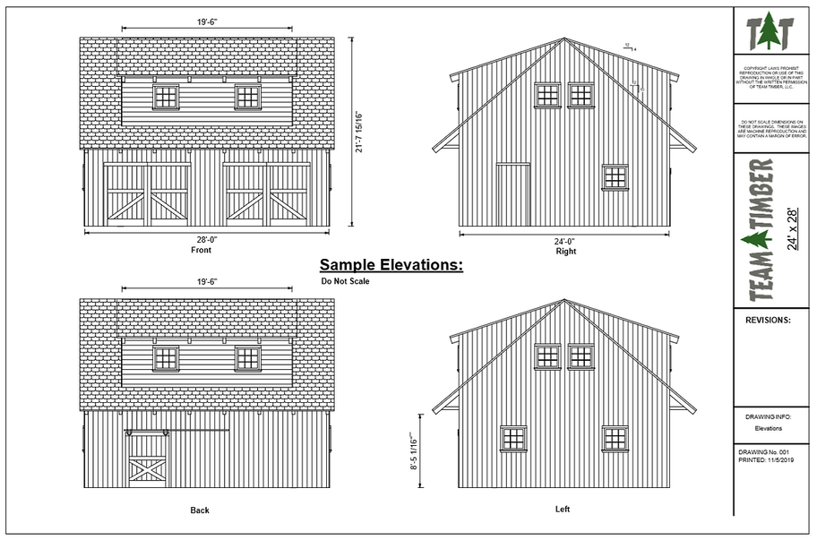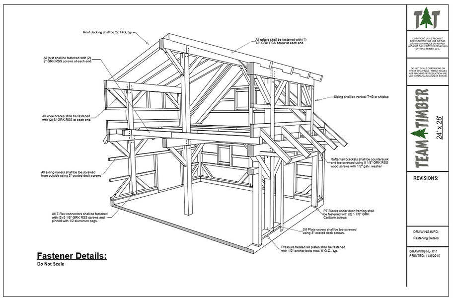 The frame design shown has not been engineered and is only intended as a general outline. It is the sole responsibility of the homeowner and/or contractor to determine if local or state code requires an engineer’s stamp on plans before erection. Team Timber, LLC does not design to a specific area and for that matter will not hold any reasonability or warranty plans if plans do not satisfy the requirements of local and/or state building codes.