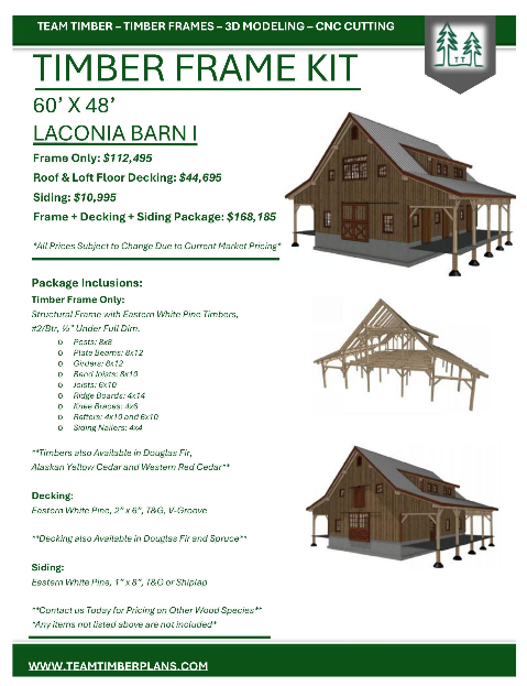 The frame design shown has not been engineered and is only intended as a general outline. It is the sole responsibility of the homeowner and/or contractor to determine if local or state code requires an engineer’s stamp on plans before erection. Team Timber, LLC does not design to a specific area and for that matter will not hold any reasonability or warranty plans if plans do not satisfy the requirements of local and/or state building codes.