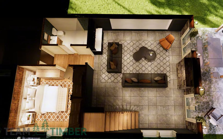 The frame design shown has not been engineered and is only intended as a general outline. It is the sole responsibility of the homeowner and/or contractor to determine if local or state code requires an engineer’s stamp on plans before erection. Team Timber, LLC does not design to a specific area and for that matter will not hold any reasonability or warranty plans if plans do not satisfy the requirements of local and/or state building codes.